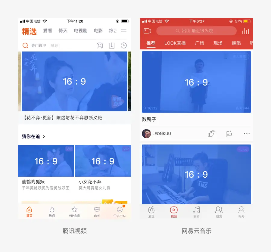 16:9 的图片比例可以呈现电影场景般的效果,多用于横向构图,是应用非常广泛的尺寸比例之一,能给用户一种视野开阔的体验。在很多影视娱乐类产品设计中运用广泛,如腾讯视频、网易云音乐等。