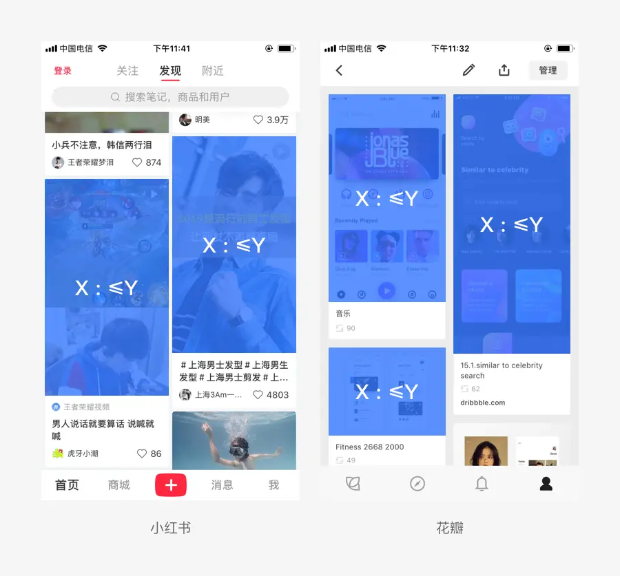 X:≤Y 代表宽度固定,高度在最大值之间自定义的瀑布流设计,在一些用于用户没有很明确的目的,只是喜欢获取尽量多的信息的情况下采用这种设计方式。X:≤Y 的图片比例要注意高度的控制,最大值不要超出屏幕可显示区域的范围。