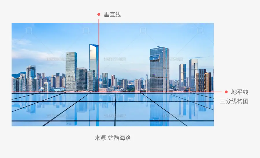 我们在选择图片的时候,如果是如同城市建筑等类型的垂直主体时,我们需要注意主体物与地平线的垂直关系。如果构图特意需要倾斜的效果另当别论,否则我们将会优先考虑这个因素,选择主体垂直的图片或者后期微调让主体垂直地平线,这样整个画面更加协调稳定。