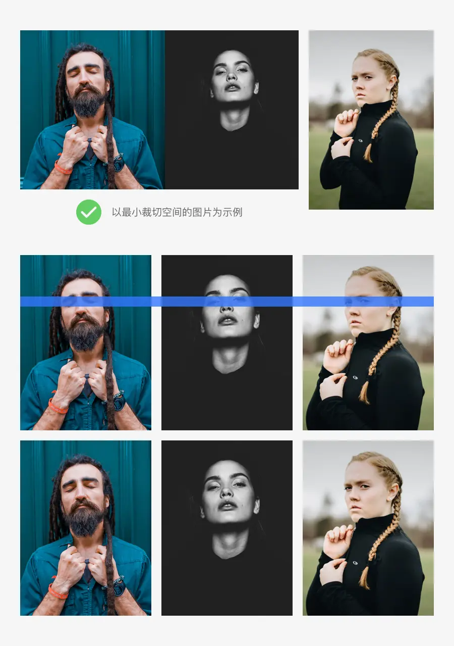 当系列图片进行排版时,需要保持图片比例尺寸的统一性,当我们在多个图片素材之间进行裁切处理时,需要以最小裁切空间的图片为示例去裁切其它图片,这样才能保证最终的展示效果。