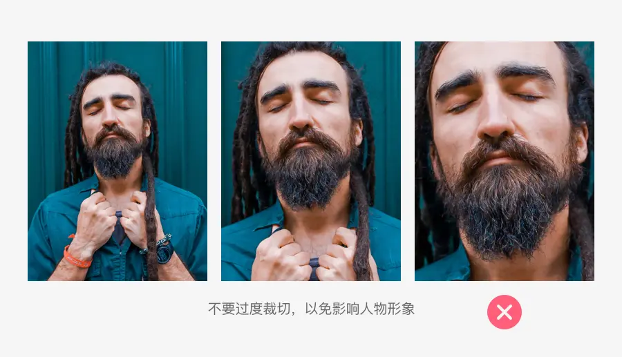 面对一些人物图片时,我们在进行裁切的时候需要注意人物的发际线。在裁切人物发际线时就会联想到秃头,因此不要太靠近人物发际线,留下足够的头发,不要过度裁切,以免影响人物形象。