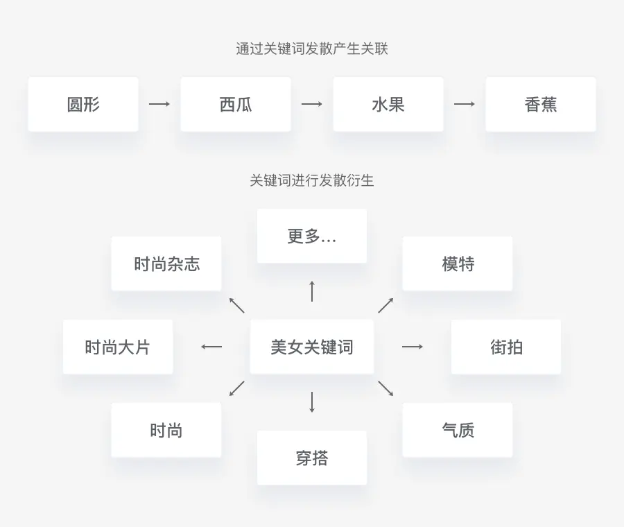 举一个简单的例子来说一下关键词发散的作用,比如圆形和香蕉是没有本质联系的,但是通过关键词发散就会产生关联,圆形→西瓜→水果→香蕉。换到图片资源中来原理相似,比如我们要找一张美女图片,不一定搜索的关键词是“美女”,这个关键词进行发散可以衍生出时尚杂志、街拍、模特、气质、时尚大片、穿搭等等关键词,这样通过发散出来的关键词也许能找到更加符合的图片资源。