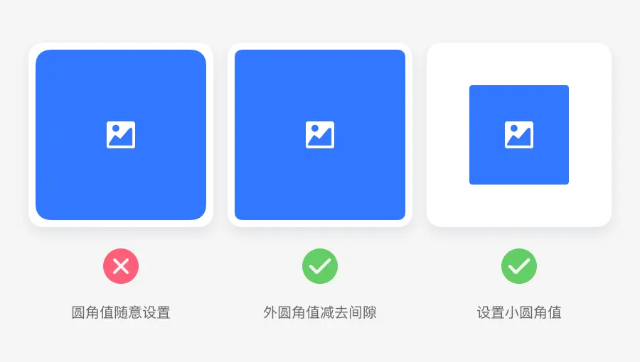现在很多产品在布局上面都在运用卡片式进行布局,如果对卡片进行圆角设置以后,对于卡片内部的图片通常也会设置一点小圆角。设置的数值由卡片外圆角数值减去它们之间的间隙数值,如果算出来的数值为负数的情况,原理上图片不做圆角值设计也是可以的,只是为了整体风格的统一,我们通常会设置一个小圆角数值。