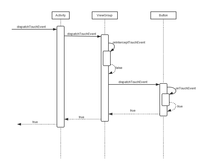 假设有一个 Activity,他的界面内容是一个 ViewGroup,ViewGroup 内还有一个 Button。当点击 Button 的位置时,会产生一连串事件,像 DOWN → UP 或者 DOWN → MOVE → MOVE → UP,这些事件分发过程的时序图如下: