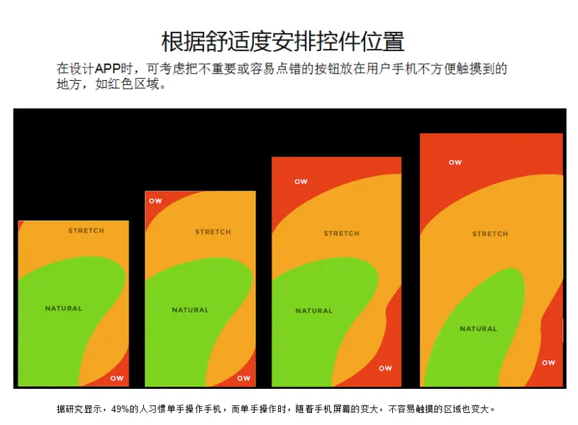 总有些手残党不小心点到按钮,导致不小心给人发信息呀,不小心删除了某文件呀,不小心点错进视频之类的,所以为了解决这类问题,最好把一些不重要或使用频次低的按钮,放在人手不方便操作的地方,PC网页一般放在边角,手机则放在如下的红色区域(据研究显示,49%的人单手操作手机,而单手操作手机时,有三个大的操作区域:方便操作到的,不是很方便操作到的,难操作到的,而红色区域就为难操作到的区域)。