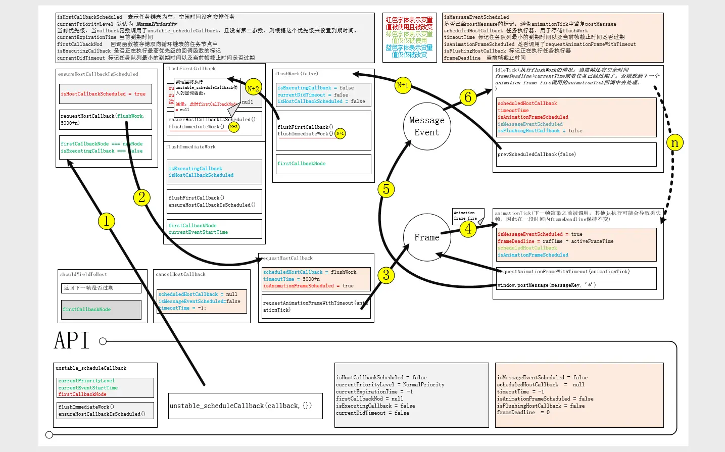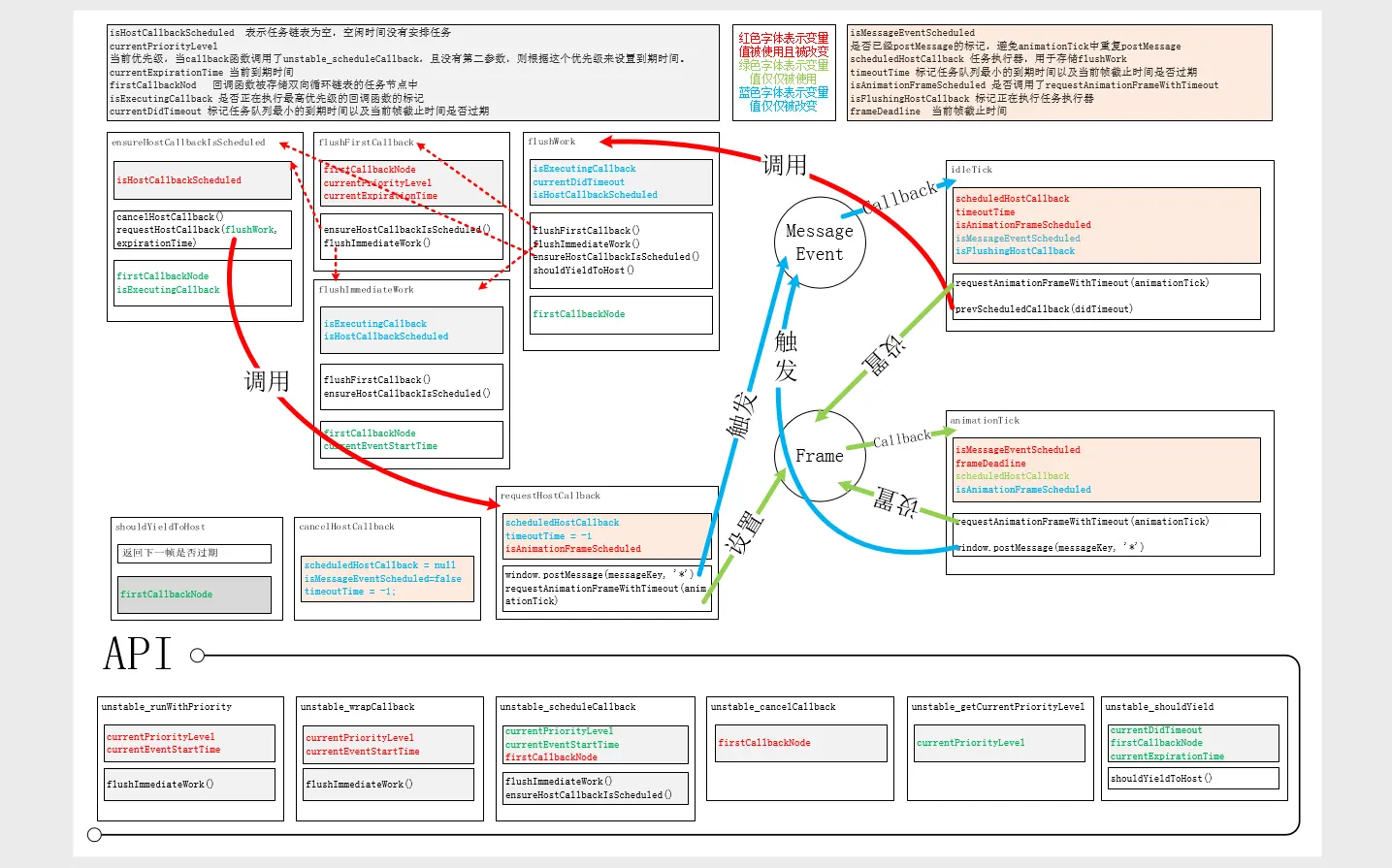 总览图:flush*为任务执行模块,主要用于执行任务的回调函数,对任务链表进行操作。idleTick与animationTick为直接调度模块,根据当前帧的空闲时间与任务链表最小到期时间来控制是否在当前帧执行任务链表还是在下一帧继续处理。ensureHostCallbackIsScheduled与requestHostCallback组成任务执行模块与调度模块的枢纽,协调两者的工作,并且ensureHostCallbackIsScheduled为外部API提供入口。