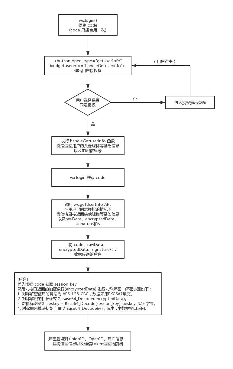 以下将针对第一种方式 —— 从 wx.getUserInfo 的解密数据中获取 UnionID 的方案,设计小程序在业务上的登录流程
