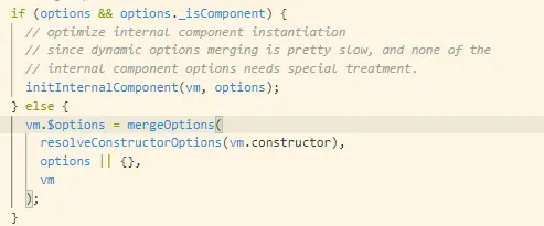 现在就很明显了,mergeOptions这个函数是用来净化实例options各个key的,然后把构造函数里的各个key和新实例中的各个key进行合并,如果碰到同名属性,以实例的为准(这个很好理解,css的样式优先级也是这样,范围越小优先度越高)