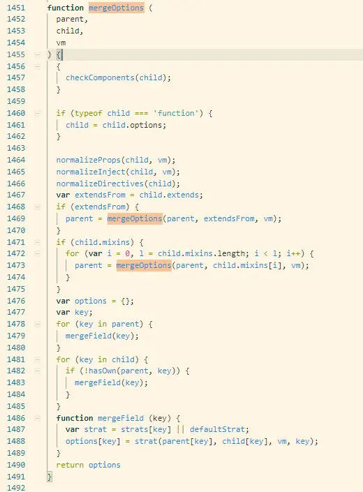 接下来就是对mixins属性对象的处理了,总的来说这两个属性就是会自带vue的实例对象或者函数,也需要进行净化内部数据(mergeOptions())。