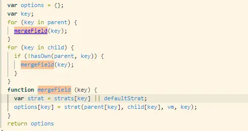 先新建一个options,然后分别循环vue构造函数和准备新建实例的options,在这里面有一个mergeField的函数, 先看第一行: