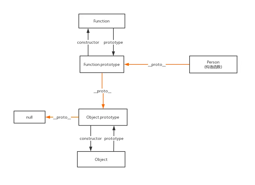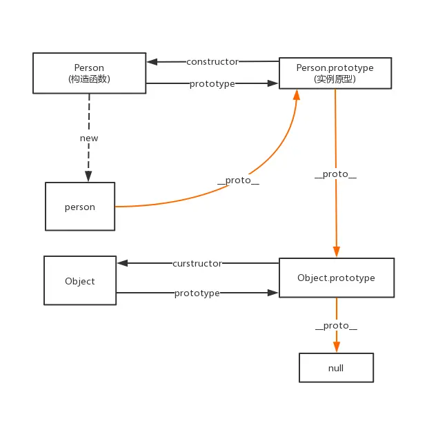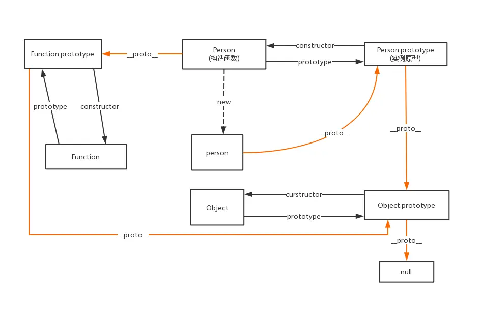 根据上述内容我们可以的到以上关系图(其中橙色线为原型链)