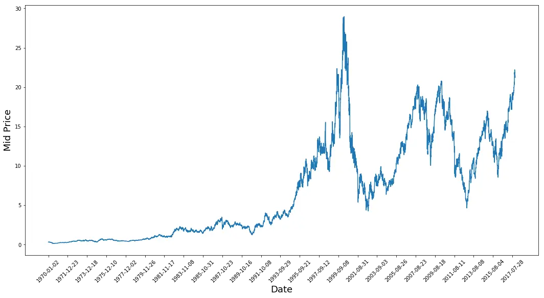这幅图包含了很多信息。我特意选取了这家公司的股价图,因为它包含了股价的多种不同规律。这将使你的模型更健壮,也让它能更好地预测不同情形下的股价。