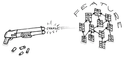 霰弹式修改(Shotgun Surgery)类似于发散式变化(Divergent Change),但实际上完全不同。发散式变化(Divergent Change)是指一个类受多种变化的影响。霰弹式修改(Shotgun Surgery)是指多种变化引发多个类相应的修改。