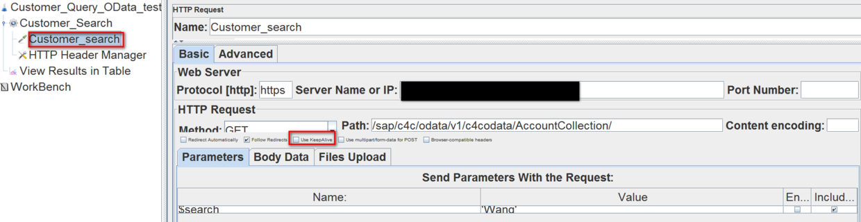 Create a new Http Request and maintain the following settings: (1) Protocol: https (2) Server name: (3) Http request method: GET (4) Http path: /sap/c4c/odata/v1/c4codata/AccountCollection/ - 这就是OData服务的相对路径了 (5) Use KeepAlive: do NOT select this checkbox - 记得这个勾别打上
