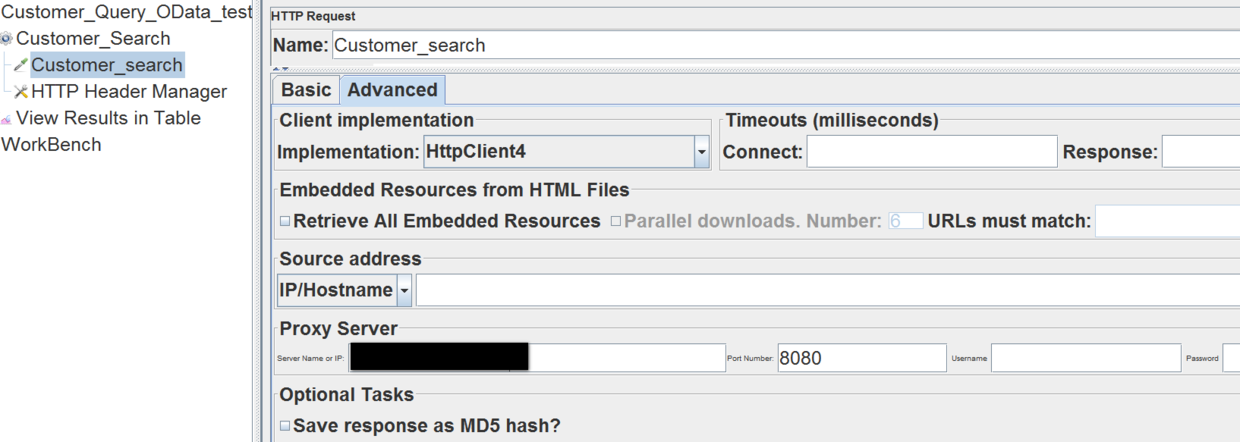 Switch to Advanced tab, choose “HttpClient4” from drop down list for Implementation, and maintain proxy server name and port number.