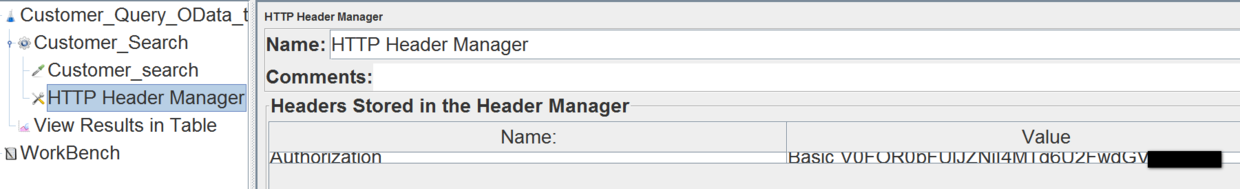 在HTTP Header Manager里维护访问这个Odata服务的credential。因为我们开发的OData服务支持Basic Authentication这种认真方式,所以我在此处的HTTP header字段里维护Authentication信息。