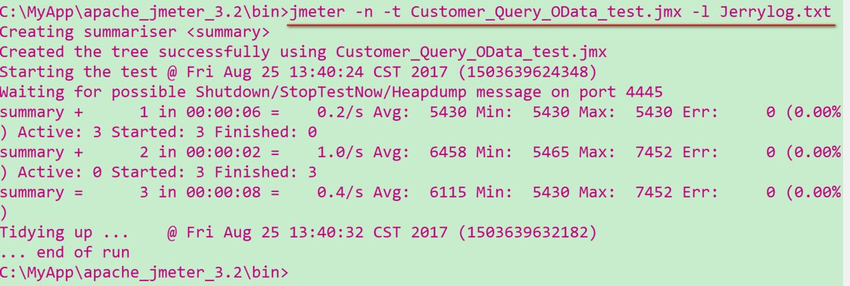 当然,jMeter也支持命令行方式使用: Or you can use command line to achieve the same: -n: use non-GUI mode -t: specify which test plan you want to run -l: specify the path of output result file