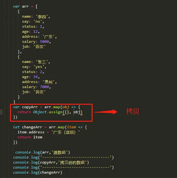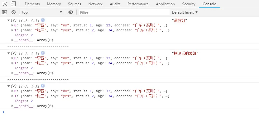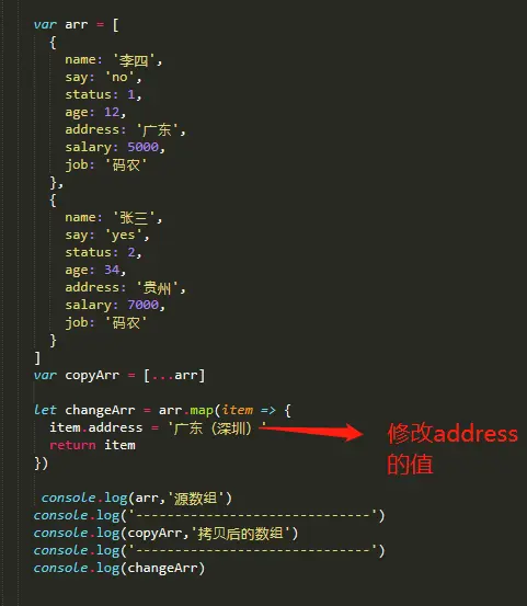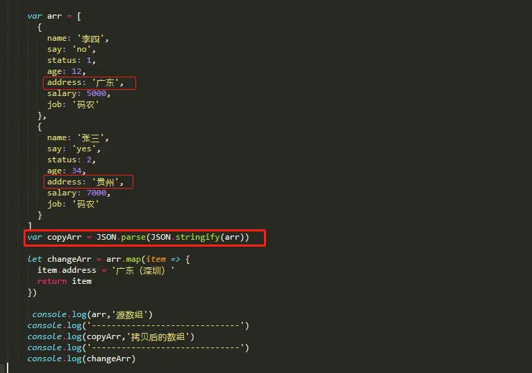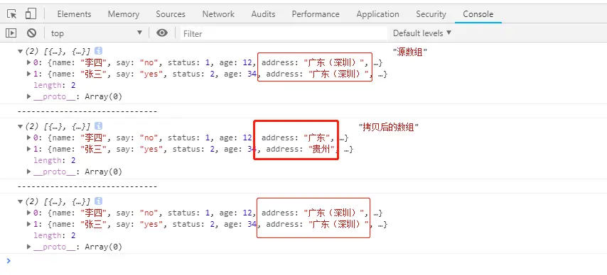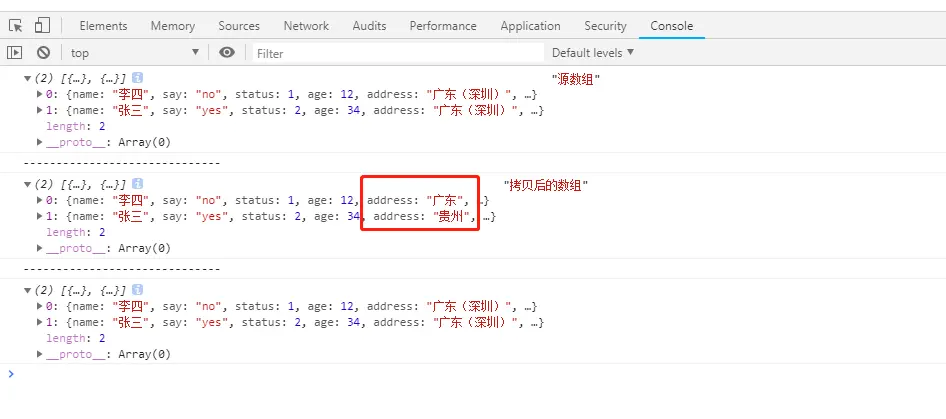 拷贝后的copyArr 的地址address 应为“广东”,“贵州”才是期望得到的数据,但是看控制台输出arr、copyArr、changeArr这三个数组里面每个对象的address 都为“广东(深圳)”