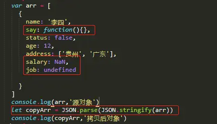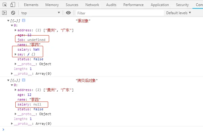 直接看代码及控制台信息,这种方式也是可以拷贝的,而且看起来代码好像比上面的更少更简洁,但是这种方法也有缺陷的,如果你对象里面某个属性的值是undefined或者function的话这种方法是拷贝不到这这种类型的属性,或者你对象里面的某个属性的值是NaN的话拷贝出来的这个属性值会变成null,通过自己代码实践如下
