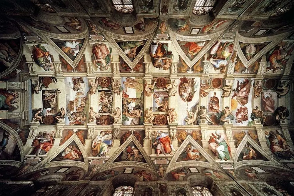 在1509年的梵蒂冈,米开朗基罗用在当时全新的透视技法,绘制了西斯廷教堂的穹顶壁画(图8)。传说米开朗基罗在这个作品花费上的时间过久,导致他患上了严重的颈椎病。在当时的人们眼里,这幅画似乎将建筑的天花板打开了一扇魔法的窗口,在目光所及之处创造了一个不存在的空间,信徒们可以透过它一窥神界的景象,感受一种——虽然是虚构的——被神明俯瞰的宗教体验。