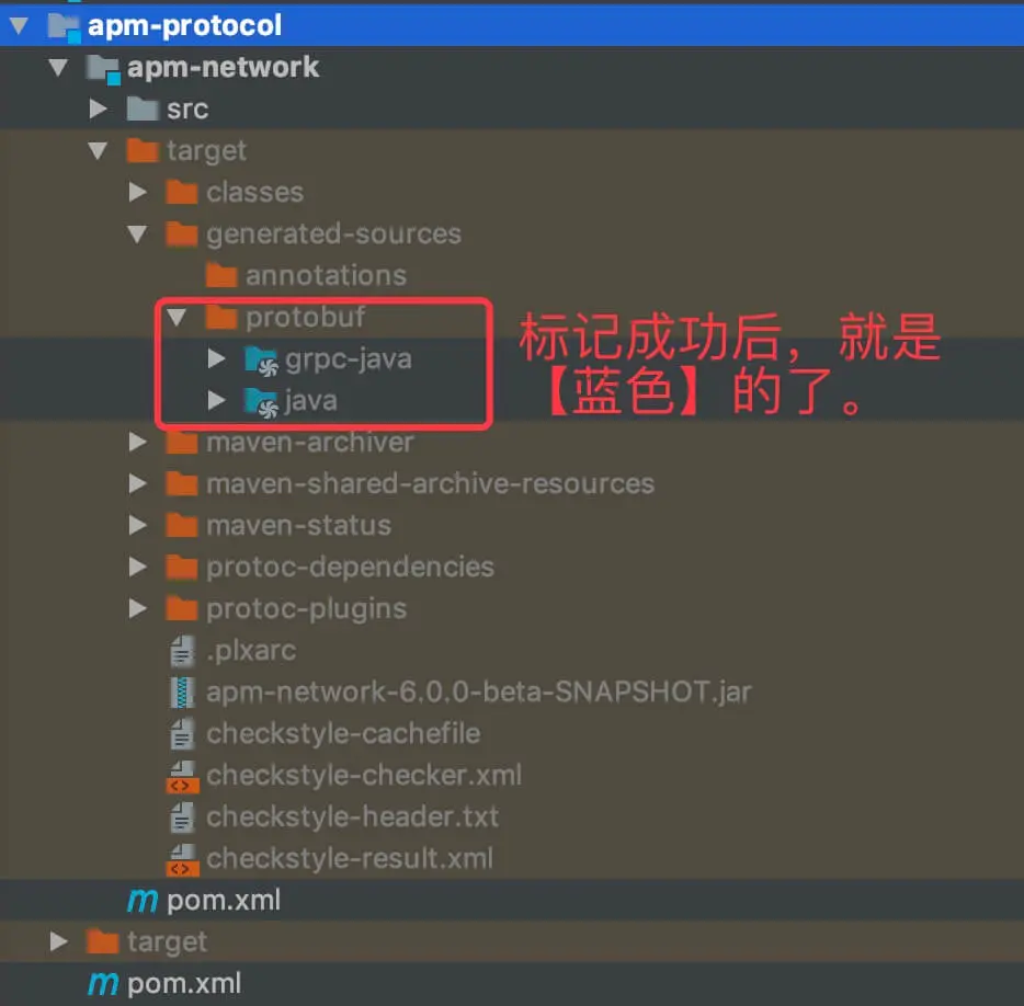 apm-protocol/apm-network/target/generated-sources/protobuf目录下面grpc-java和java目录右键设置为Generated Rources Root。 - 将