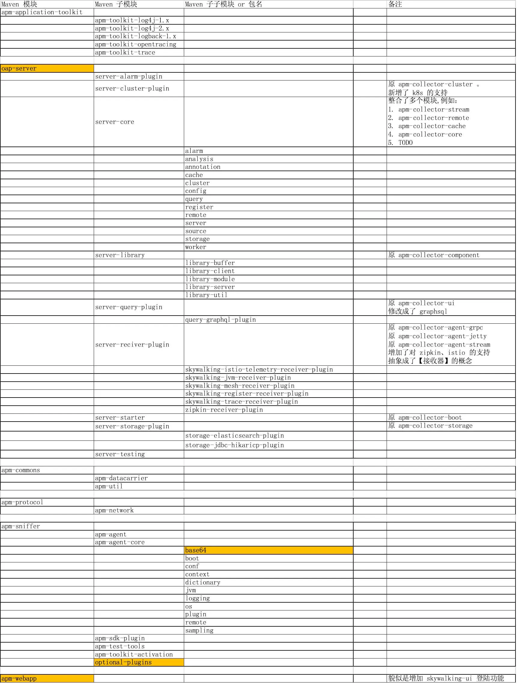 如下是笔者在 SkyWalking 3.x 对代码量和用途的简单整理,完善度比较低,可能有一丢丢的帮助:
