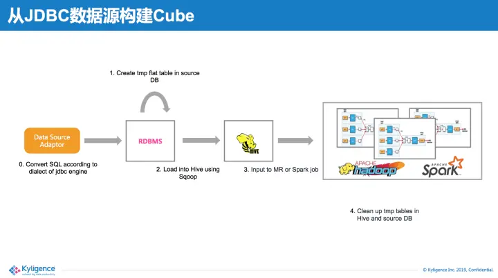 JDBC数据源构建的过程如下图所示,依赖sqoop在数据源中执行打平表的任务,然后把数据传送到Hadoop集群,然后通过一系列MapReduce或Spark任务执行后续构建任务。Adaptor在构建过程的主要作用是,将Apache Kylin产生的打平表SQL语句转化为数据源可支持的SQL方言。