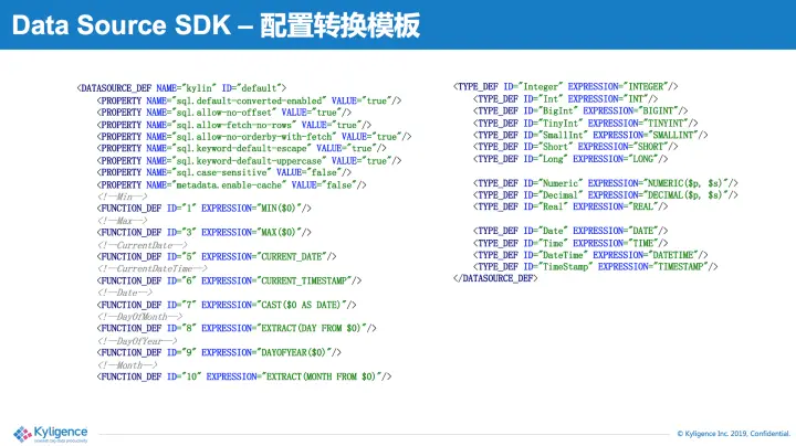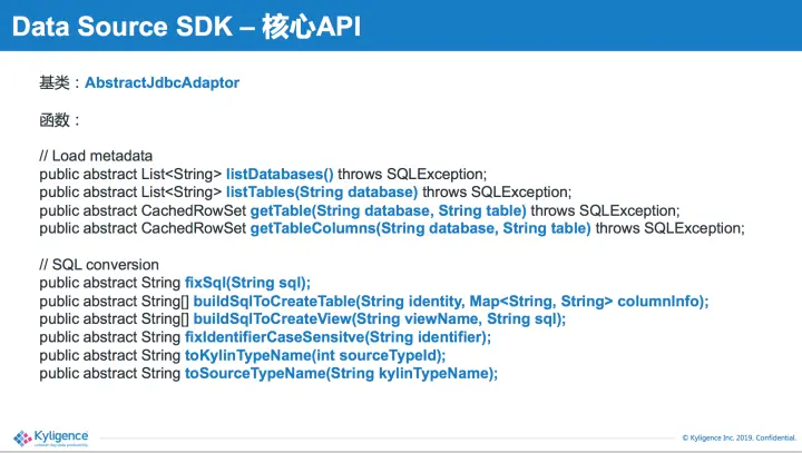 但是,JDBC数据源各不相同,想要深度实现某种数据源的对接,需要开发者投入大量精力对数据源做适配。因此Apache Kylin v2.6推出了Data Source SDK的功能,可以帮助开发者快速开发JDBC数据源的适配,实现新数据源的对接。