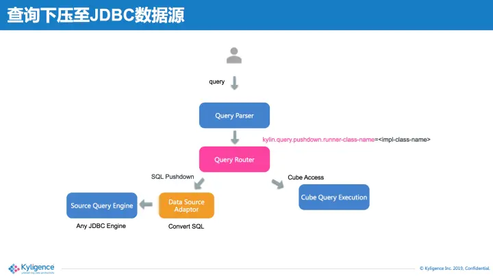 在查询下压也是类似。Apache Kylin支持将无法命中Cube的查询路由到数据源引擎中执行,然后把结果返回给用户。Adaptor在查询下压中的过程也是实现SQL方言转换,把用户输入的SQL语句从Apache Kylin的SQL方言转换为底层数据源引擎的SQL方言。