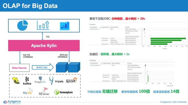 如上图右侧所示,我们使用Tableau报表做了测试:同样的报表在查询下压和访问Cube两种模式下执行,均能正常渲染,且无需修改报表内容,同时获得14倍的效率提升,可以有效帮助企业用户实现数据分析从传统技术向大数据平台的迁移。