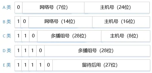 我们应该都听说过,IP 地址分为 A、B、C、D、E 五类。对于 A、B、C 类,主要分两部分,前面一部分是网络号,后面一部分是主机号。