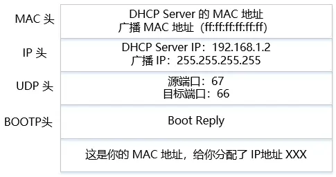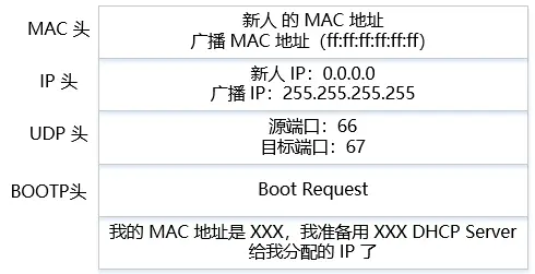 新来的机器使用 IP 地址 0.0.0.0 发送了一个广播包,目的 IP 地址是 255.255.255.255。广播包封装在 UDP 里面,UDP 封装在 BOOTP 里面。在这个广播包里,新人大喊:我是新来的(Boot Request),我的 MAC 地址是 xxx,我还没有 IP,谁能给我个 IP 地址?格式就像下面这样: