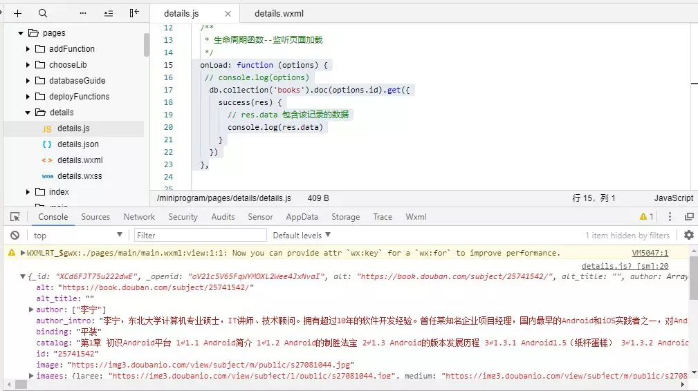 打开实战一里面写的小程序端的扫码的js界面,把这个方法放在 success里面。 要调用的云函数的名称 name要改成成实战二教程里面建立的云函数bookinfo: