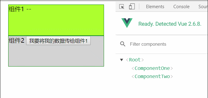 我将要实现的是:点击按钮,将组件2中的数据传递给组件1,在组件1中展示。