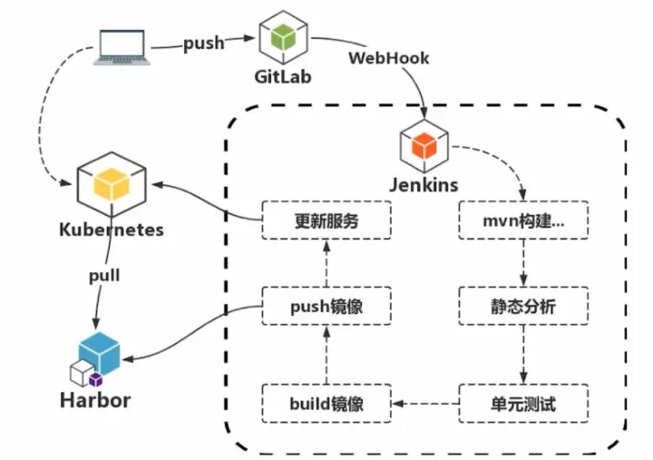 - jenkins做的事情就比较多 3.1 构建代码 3.2 静态分析 3.3 单元测试 3.4 build镜像 3.5 推送push镜像仓库 3.6 调用k8s的api