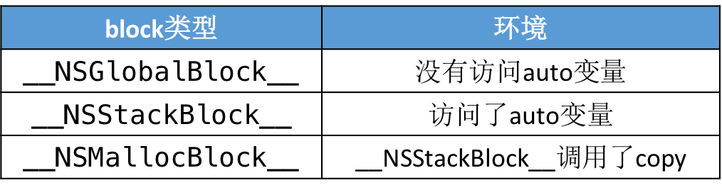 __NSGlobalBlock__存在于内存的数据区域(.data区)__NSStackBlock__存在于内存的栈区__NSMallocBlock__存在于内存的堆区