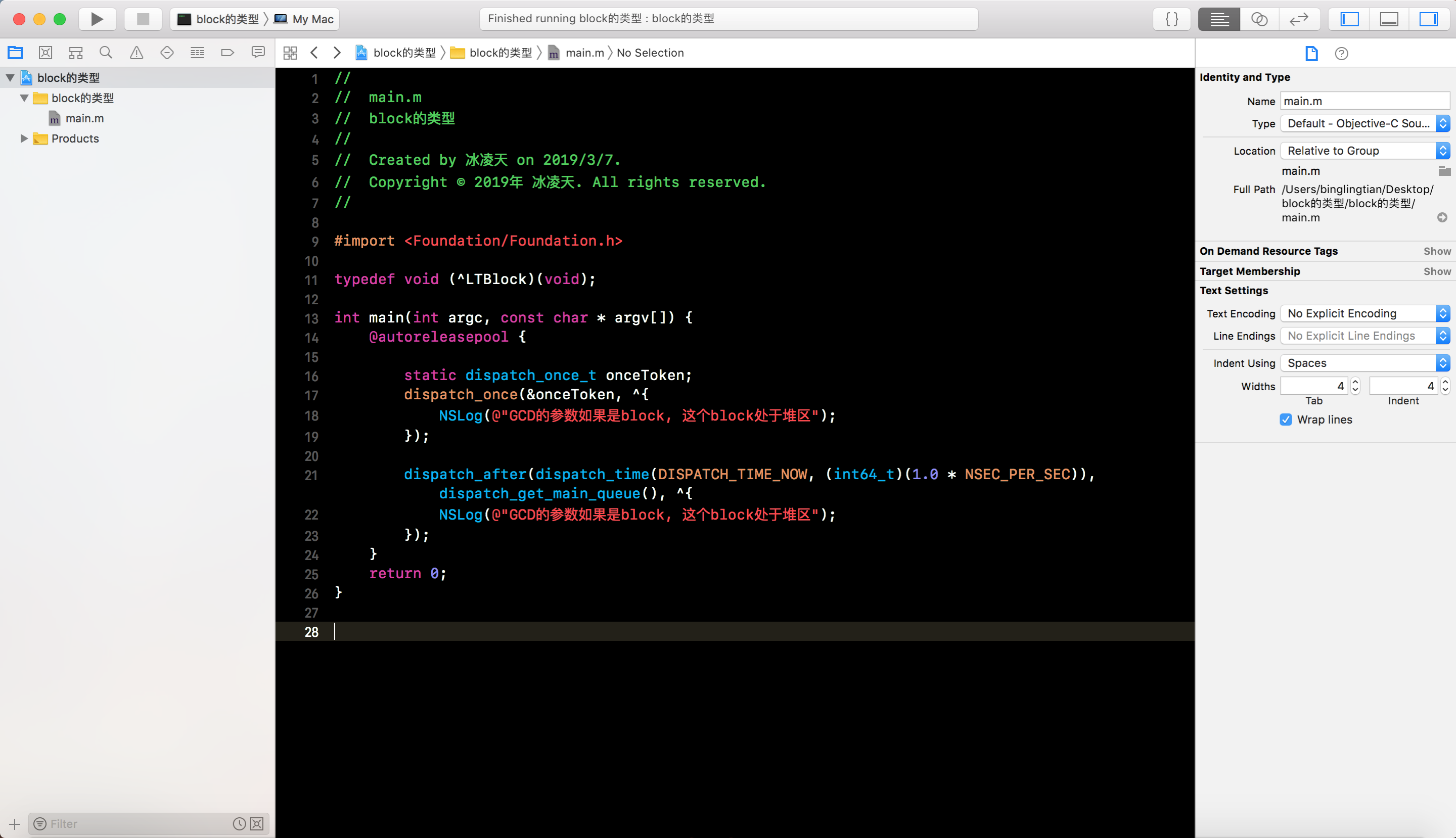 block从堆上移除时, 又会被调用__main_block_dispose_0函数, 对捕获的对象类型的auto变量解除强引用 - 而在栈上的