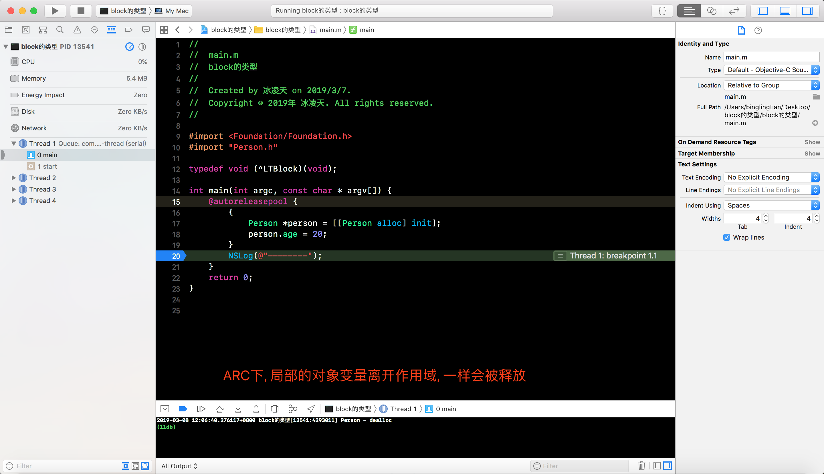 - 在ARC下, 局部的对象变量离开作用域时, 一样会被释放