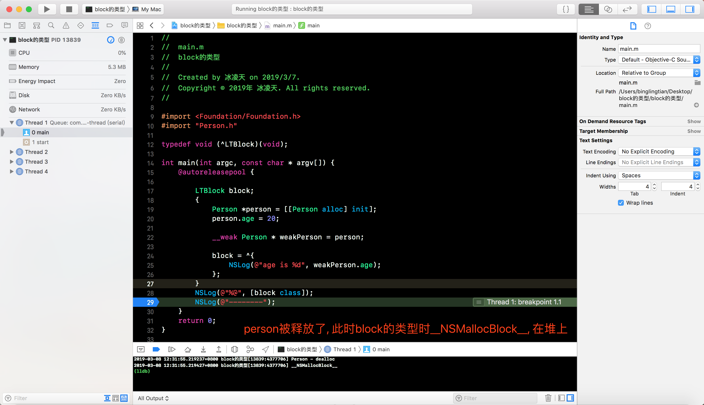 block复制到堆上, 此时person对象没有被释放,说明block在复制到堆上时对person进行了一次retain处理 - 如果我们释放掉堆中的
