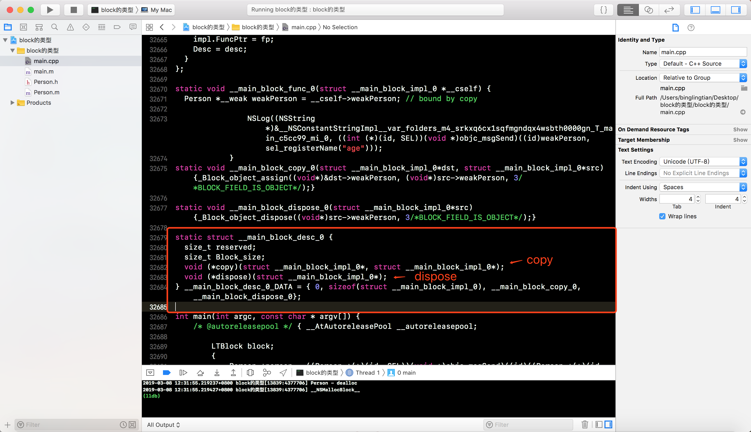 __main_block_desc_0中依然有copy和dispose, 只不过不在对person进行强引用