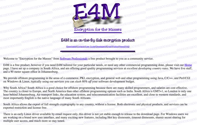 九十年代后期诞生了开源软件运动,保罗也在澳大利亚免费发布了一个加密工具E4M,网站宣言是:“现实世界里,为隐私而战早已不存在了。随着越来越多的人类活动将网络化,各国政府竞相扩大权力范围。强加密才能帮你抵挡这样的入侵,保护你的权利,确保你在信息时代里的自由。”