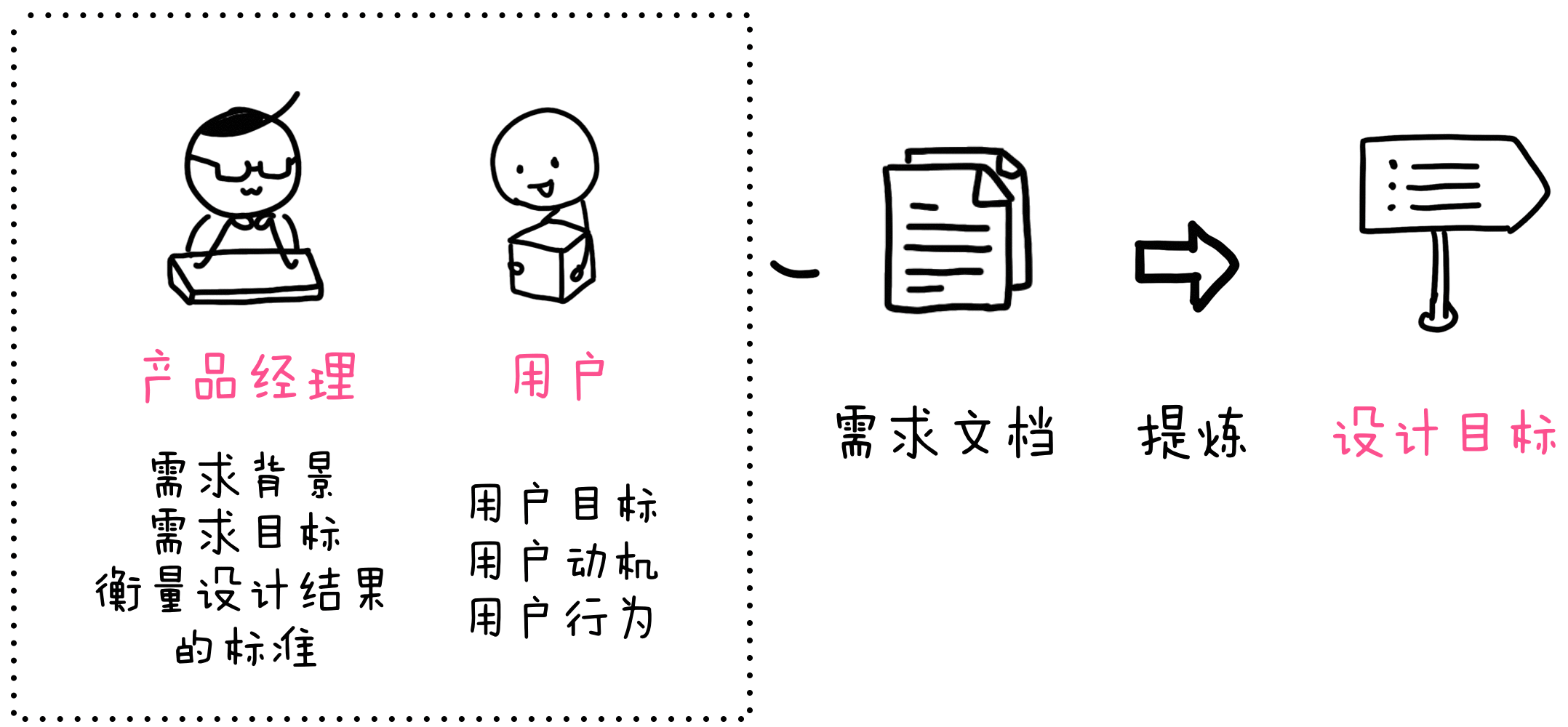 产品经理代表需求背后的商业诉求,需要从他们身上了解需求背景、目标、诉求等等;而用户代表着我们最终服务的对象,他们在特定场景下的目标、动机和行为都是需要我们仔细斟酌的。充分考虑这两个关键角色各自诉求,推导出方案设计目标,最终出来的方案才经得住验证和挑战。