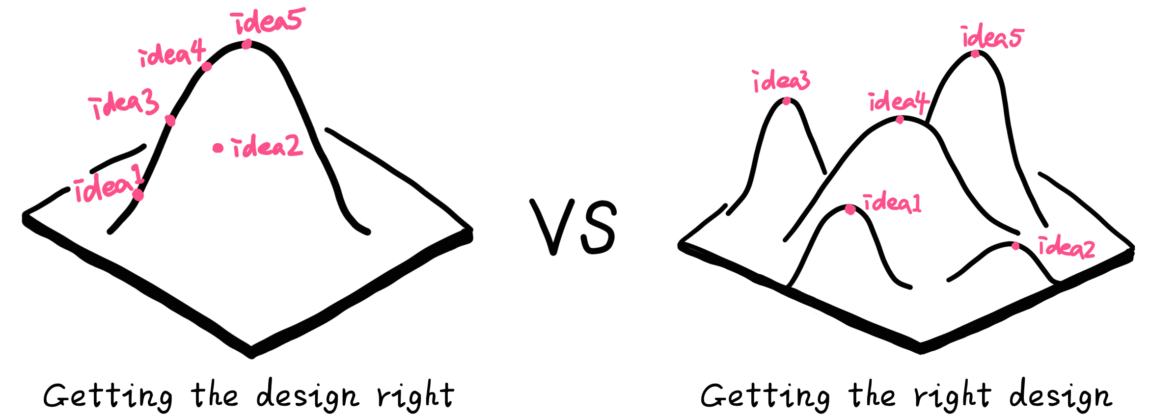 为什么强调不同的思考起点?因为只在一个idea上进行深化,总归是一类想法,这条路径只是“将设计变得更加正确”(Getting the design right)。而尽可能改变思考起点,从不同地方开始假设,就会得到完全不一样、适用于不同情境的方案,这条路径就能通往“做正确的设计”(Getting the design right)。通过穷尽各种方案,设定判断标准,由此推导出最优解。