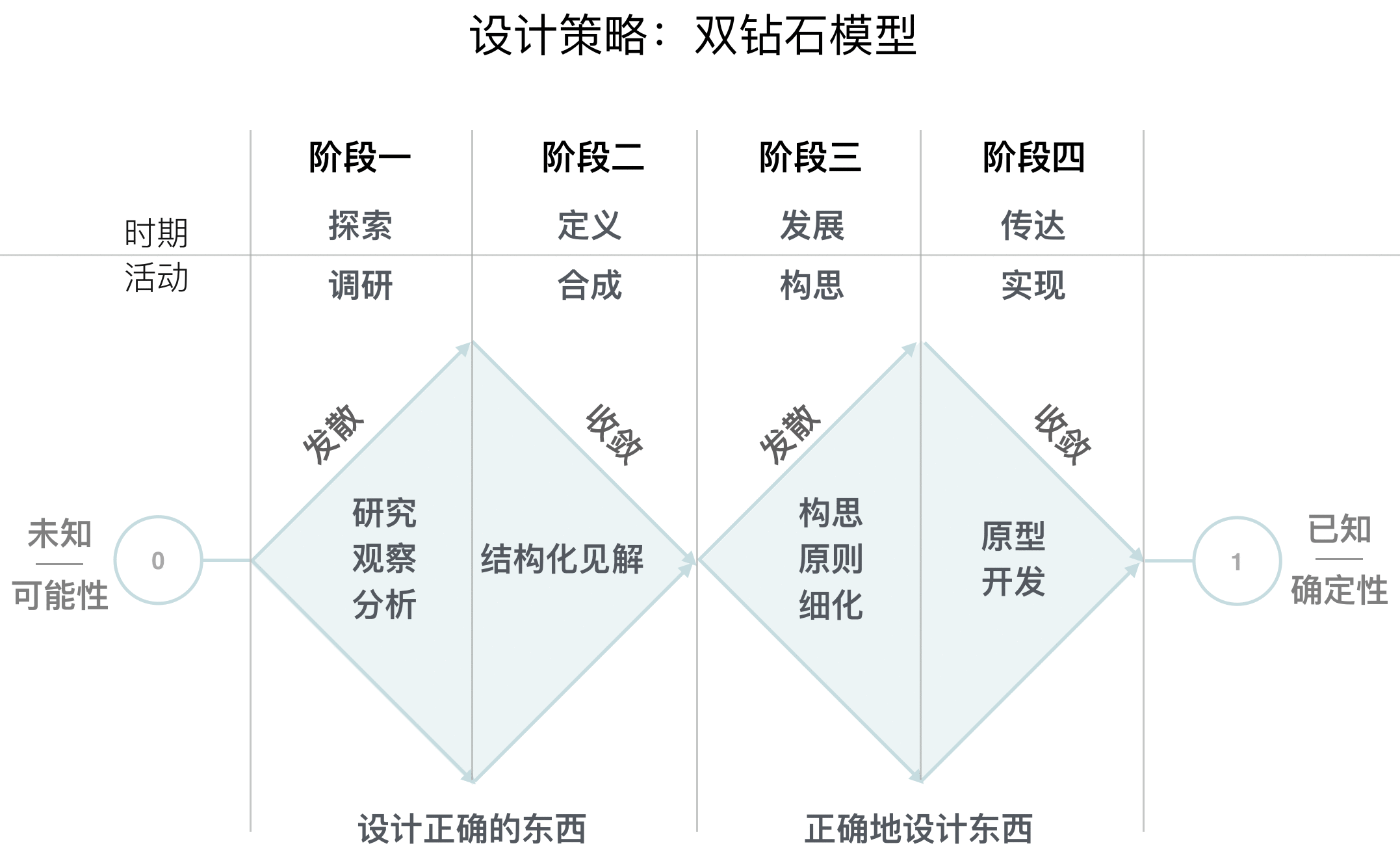 实习期间负责了一个从0到1的“泛知识”音视频产品设计,需要在短短10天的时间内产出一套有亮点的产品方案。对于一个一直只负责边缘需求的实习鹅,这压力自然很大。于是我就用双钻石模型,将整个产品设计活动分成四个阶段。