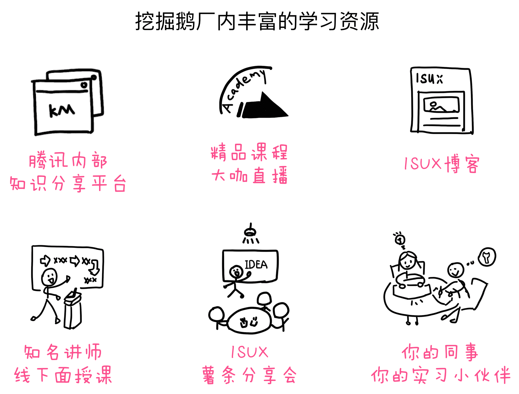 每个小需求都可以转化成一个对未知问题的探求。为什么要转化成问题?因为对我来说,问题能引发好奇心,好奇心有助于吸收知识。我接到需求后,习惯性去提炼出一个个问题,并发散性地进行相关知识性输入,有必要的时候会报课或者听讲座去现场听。这里就不得不赞一下鹅厂的学习资源,无论线上线下资源都非常丰富,并且对实习生几乎0门槛开放。