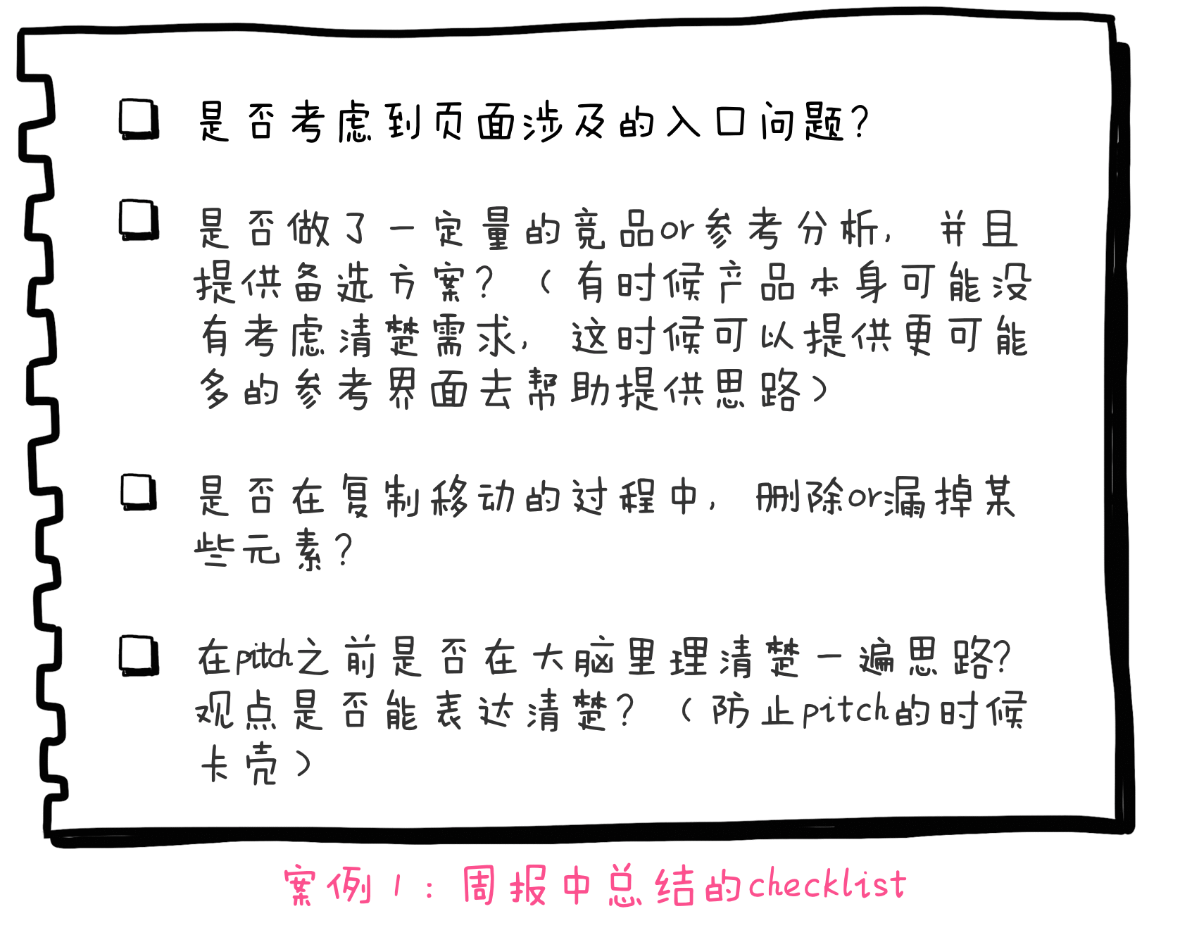 提交方案之后,为了降低自己日后爬坑的概率,进一步提高效率,我会用checklist和总结策略的方式来对设计活动进行小结。