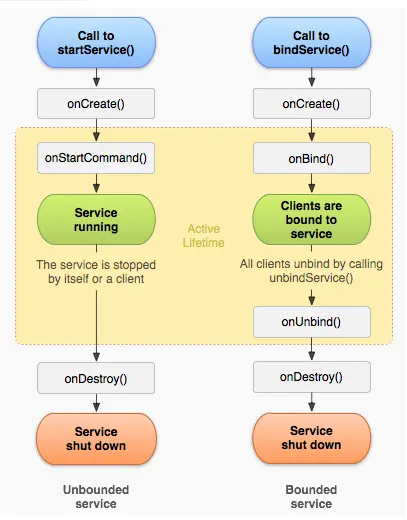 - bindService():如果该服务之前还没创建,系统回调顺序为onCreate()→onBind()。如果调用bindService()方法前服务已经被绑定,多次调用bindService()方法不会多次创建服务及绑定。如果调用者希望与正在绑定的服务解除绑定,可以调用unbindService()方法,回调顺序为onUnbind()→onDestroy();