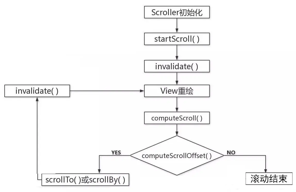 - 当View重绘后会在draw方法中调用computeScroll方法,而computeScroll又会去向Scroller获取当前的scrollX和scrollY;然后通过scrollTo方法实现滑动;接着又调用postInvalidate方法来进行第二次重绘,和之前流程一样,如此反复导致View不断进行小幅度的滑动,而多次的小幅度滑动就组成了弹性滑动,直到整个滑动过成结束