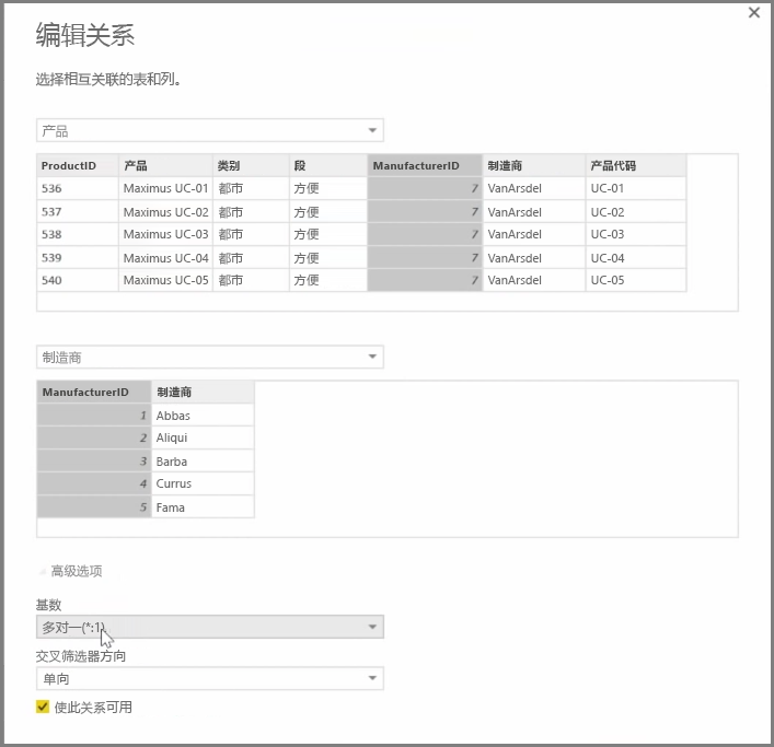 基数的选项有多对一和一对一。多对一是维度类型关系事实,例如一张销售表,每种产品都具有多行数据,与之匹配的是一个表格,在唯一行中列出了所有产品。一对一通常用于链接引用表格中的单个条目。默认情况下,关系将设置为在两个方向上交叉筛选。只在一个方向交叉筛选限制了关系中的某些建模功能。设置数据之间的准确关系让你能够在多个数据元素间创建复杂的计算。
