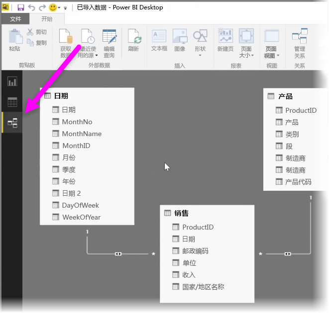 Power BI 允许你以可视方式设置表或元素之间的关系。 若要查看数据的图表视图,需要使用关系视图:(位于报表画布旁屏幕的最左侧)